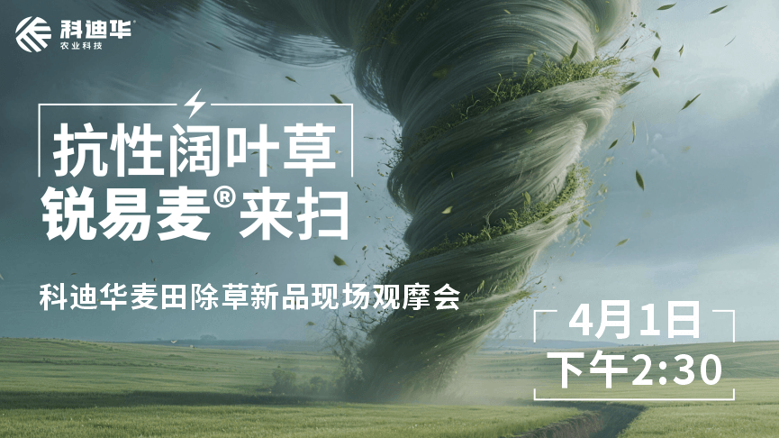 4月1日下午2:30,科迪华邀您锁定直播间,带您走进江苏泗阳观摩会现场,实地观摩麦田除草新品——锐易麦®的现场表现。从成分解析到防效实测,看这款新品如何精准、高效解决抗性难题,为麦田丰收保驾护航。